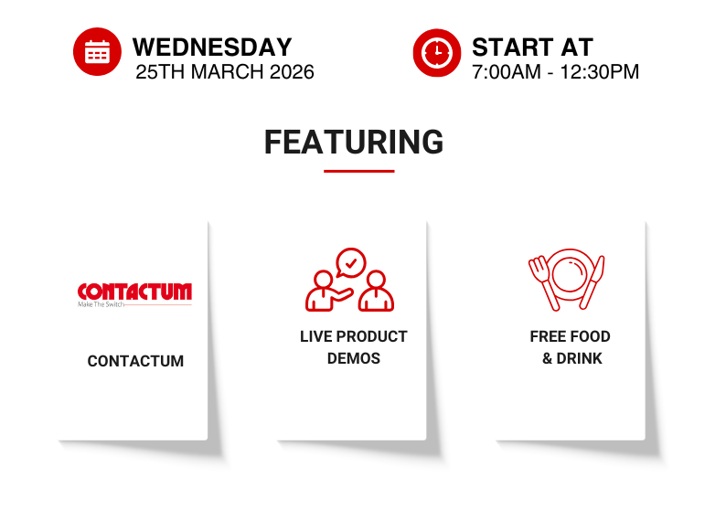 Start your morning right and drop in anytime between 7:00 AM – 12:30 PM. Meet the experts, discover how Contactum products can support your electrical projects, and see live product demonstrations in action.